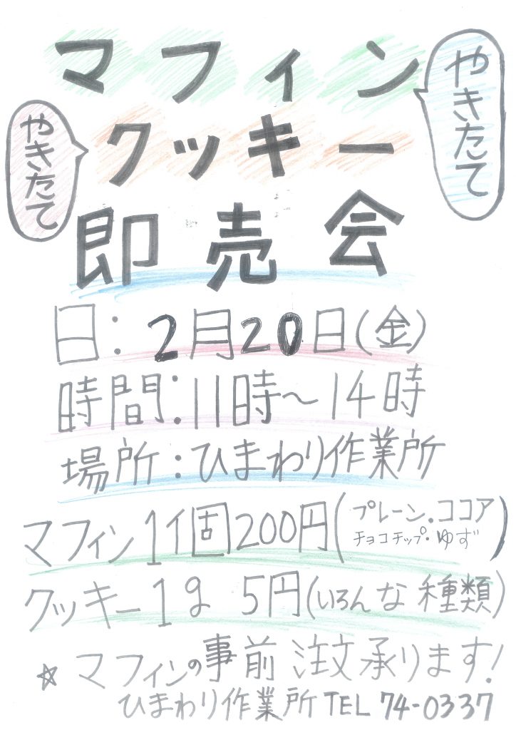 | 2月20日(金) | 11時~14時 | ひまわり作業所 | 焼きたてクッキー (いろんな種類) 1g5円 |